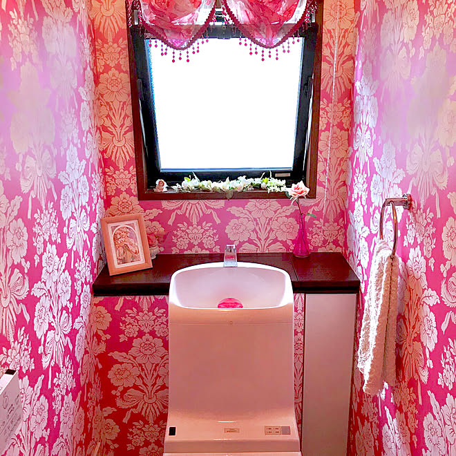 バス トイレ 実家にて ピンク ダマスク柄 アクセントクロス などのインテリア実例 18 09 25 19 38 00 Roomclip ルームクリップ